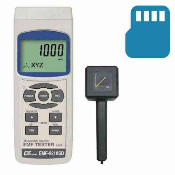 Lutron EMF-8218SD - 3 Axis EMF Tester with SD Card Datalogger is designed to measure electromagnetic fields in three directions (X, Y, and Z), and provides a comprehensive measurement by summing the total values of electromagnetic fields from these dimensions. This model has a built-in clock and calendar for time-stamping of data, and comes with SD card (1Gb to 16Gb). The EMF-8218SD is not suitable for domestic use.