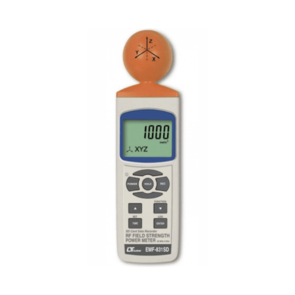 Lutron EMF-831SD - RF Field Strength Power Meter with SD Card Data Logger is a RF level meter used to measure signals from sources that include GSM, CDMA, TDMA, Wi-Fi, WiMAX, Bluetooth, security systems, cordless phones, and Zigbee. This model can detect frequencies from 50MHz to 3.5GHz and supports SD cards from 1Gb to 16Gb capacity.