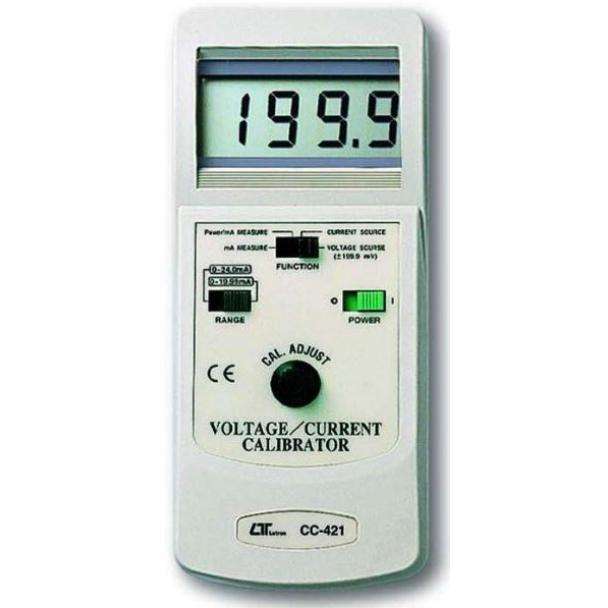 The Lutron CC-421 is a versatile and cost-effective voltage and current calibrator. It can power (12 V) and measure current in two-wire loops, ranging from 0 to 24 mA across two ranges. Its DC millivolt source ranges from -199.9mV to +199.9mV. The current calibrator can drive loads up to 500 ohms. It has a quick sampling time of approximately 0.4 seconds.